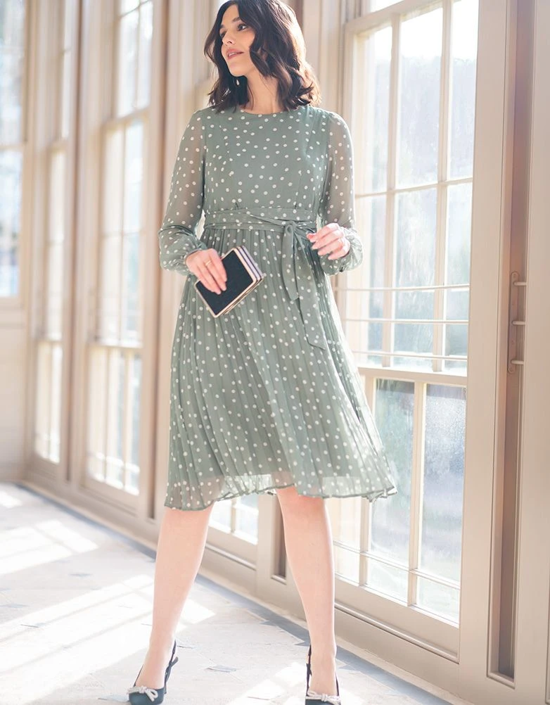 En mousseline douce, la robe grossesse et allaitement vert sauge à pois de Seraphine est la robe parfaite des futures et jeunes mamans pour les grandes occasions. Avec sa coupe flatteuse qui vous accompagne tout au long de votre parcours de maternité, ce modèle est doté d’une jupe légèrement plissée qui drape élégamment votre silhouette à mesure qu’elle évolue, tandis que la coupe empire donne l’illusion d’une taille très haute. Des fermetures éclair invisibles sont habilement dissimulées dans le corsage, permettant d’allaiter en toute facilité après la naissance de bébé. Des manches semi-transparentes et un imprimé original à pois complètent le look, parfait pour les grandes occasions (mariage, baby shower, etc.).