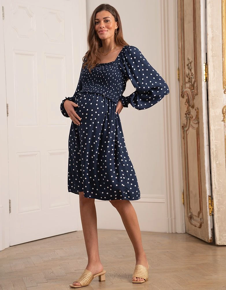 Élégante, flatteuse et charmante à souhait, notre robe grossesse et allaitement froncée bleu marine à pois trouve aisément sa place dans votre garde-robe de jeune maman. Confectionné en viscose tissée toute douce, ce modèle drape magnifiquement votre ventre, tandis que le corsage smocké ultra-extensible assure un ajustement parfait à chaque étape de la grossesse. Après l’arrivée de bébé, le haut se soulève pour révéler notre empiècement malin pour l’allaitement, parfait pour allaiter ou tirer votre lait où que vous soyez. L’imprimé à pois rétro et les manches longues aux élégants poignets froncés en font une option raffinée à porter en toute occasion.