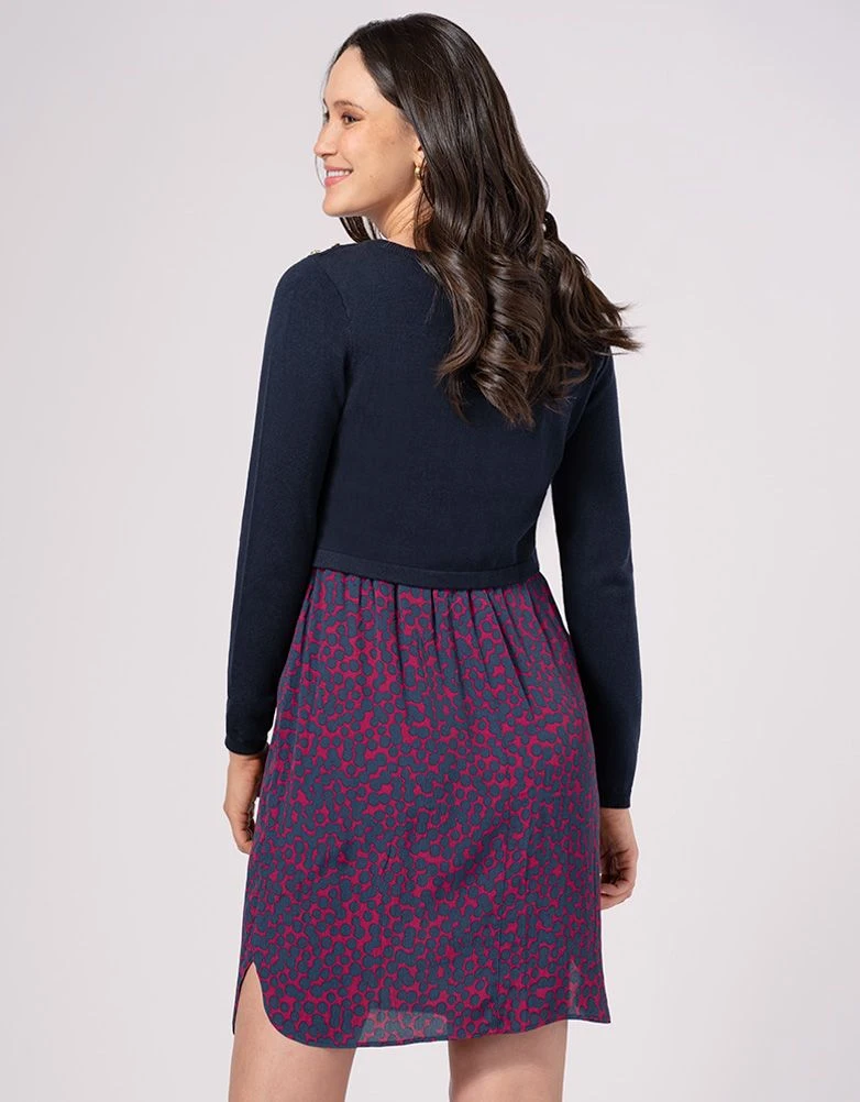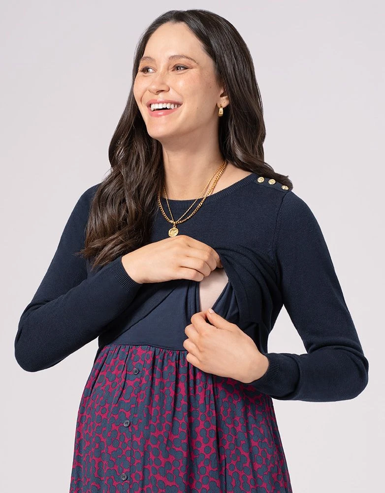 Tendance, confortable et facile à porter, notre robe de grossesse et d’allaitement haut en maille bleu marine offre une taille parfaitement ajustée tout au long de la grossesse et après. La jupe fluide drape vos courbes de femme enceinte et présente un imprimé moderne avec des boutons complétant le style. Le haut en maille est amovible et met en valeur votre taille empire et votre silhouette. Une fois bébé né, le haut se soulève afin de permettre un accès facile et discret pour à l’allaitement.