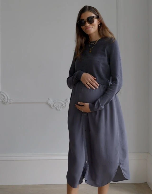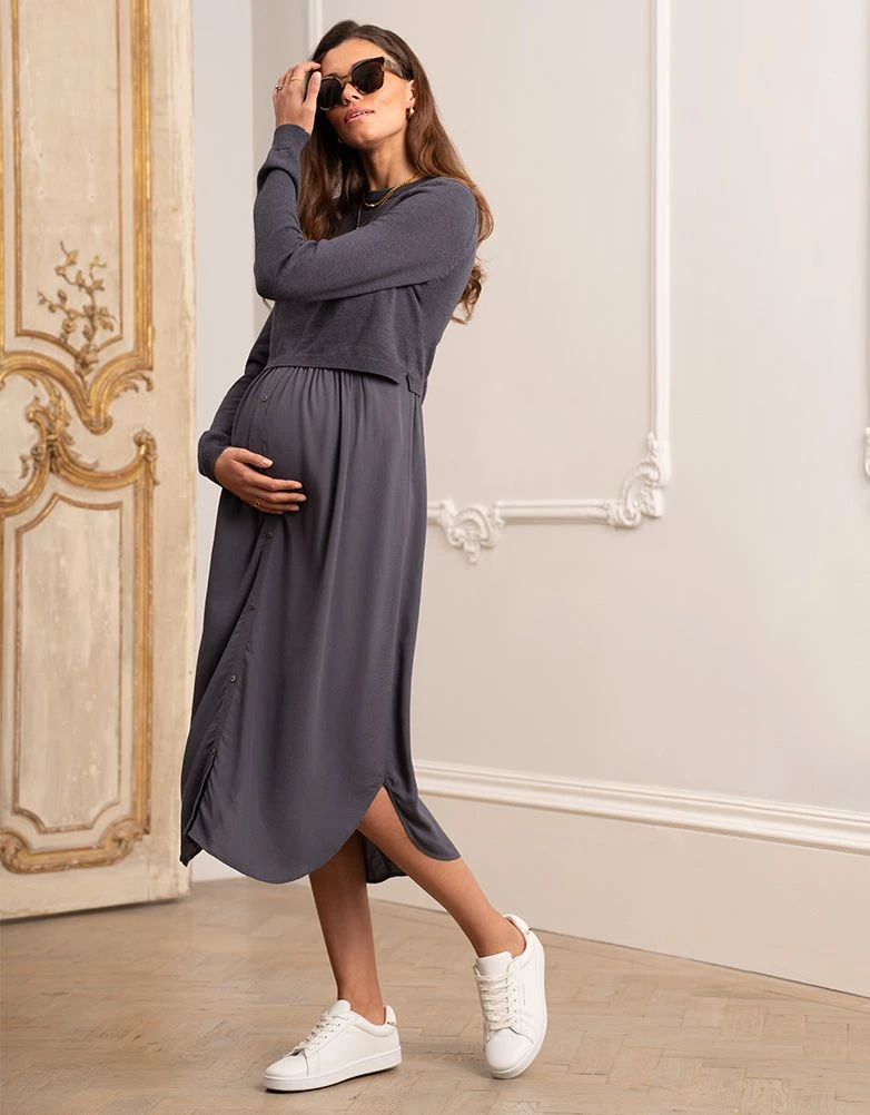 Un incontournable de la saison, notre robe grossesse et allaitement mi-longue gris ardoise est parfaite avant, pendant et aprĂšs la grossesse. La jupe tissĂ©e toute douce drape magnifiquement votre silhouette Ă tous les stades de la maternitĂ©. Mais ce modĂšle nâest pas seulement joli et confortable, il est aussi trĂšs malin ! Le pull amovible en coton mĂ©langĂ©, qui peut ĂȘtre lavĂ© et portĂ© sĂ©parĂ©ment, se soulĂšve pour allaiter en toute simplicitĂ© une fois que bĂ©bĂ© est nĂ©. Ă porter au quotidien avec des collants et des bottines.