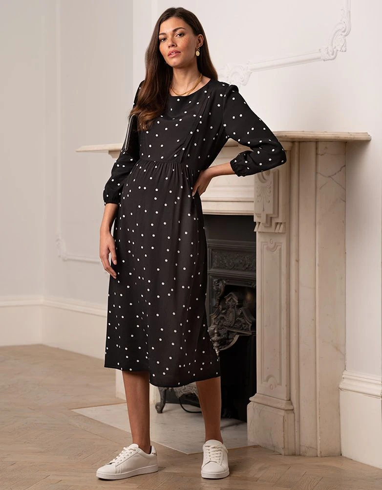 Notre robe grossesse et allaitement mi-longue noire à pois est une « petite robe noire » facile à porter rehaussée d’un subtil imprimé à pois, l’un de ces modèles phares dont vous ne pourrez plus vous passer. Confectionnée en viscose tissée toute douce pour un maximum de confort, elle offre une coupe féminine flatteuse et épouse votre ventre qui s’arrondit. Après l’arrivée de bébé, vous pourrez l’allaiter ou tirer votre lait en toute simplicité où que vous soyez grâce à de discrètes fermetures éclair qui s’ouvrent sur le devant. Des poignets élastiqués complètent le look, ce qui en fait un modèle idéal au bureau, à la maison et où que vous soyez.