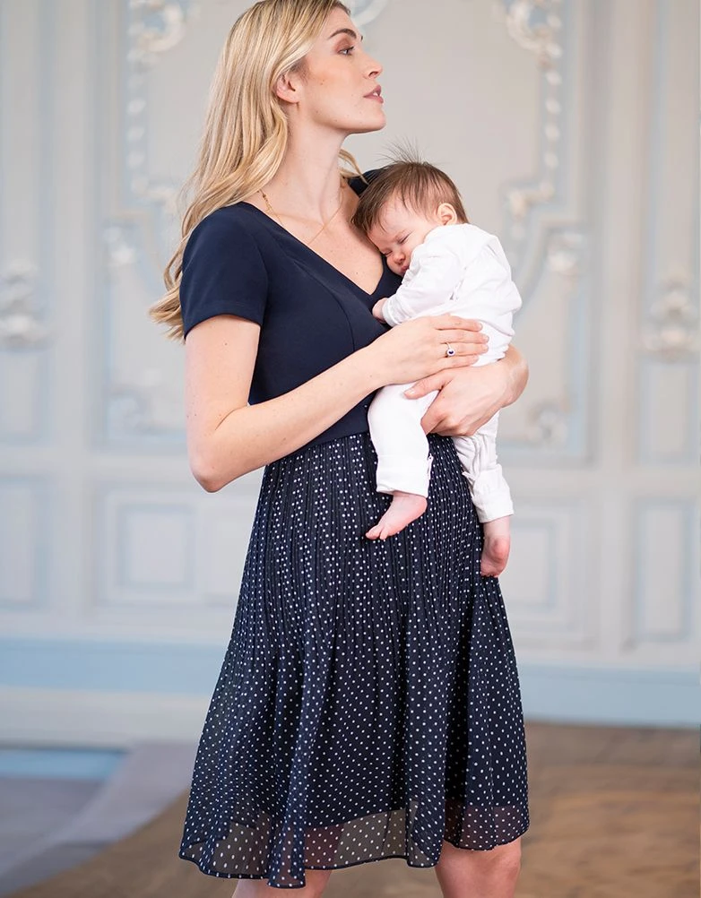 Conçue pour souligner votre taille Empire, cette robe de grossesse d’allaitement plissée bleue marine est l’option classique à avoir dans sa garde-robe du bureau au soir. Sa jupe plissée douce épouse magnifiquement votre ventre, vous offrant assez d’espace pour évoluer tout au long de vos neuf mois. Un corsage court en Ponte di Roma met en évidence votre point le plus mince. Après la naissance de bébé, il suffit d’ouvrir les fermetures éclairs pour avoir un accès à l’allaitement discret. C’est la robe idéale pour vous évènements spéciaux pendant la grossesse ou avec un bébé.