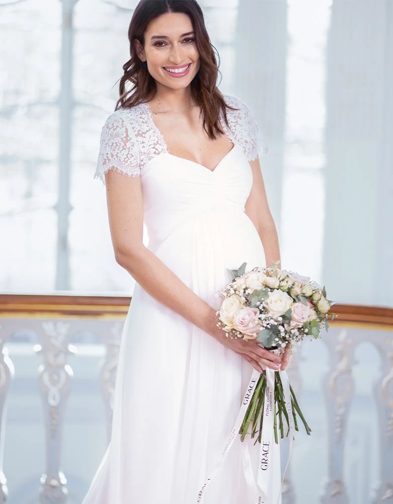 Resplendissez et sentez-vous sensationnelle pour votre grand jour avec notre sublime robe de mariée maternité longue ! Réalisée entièrement en soie et doublée, la coupe sublimera vos nouvelles formes de femme enceinte et tombera en cascade jusqu’au sol. La dentelle couvrira délicatement vos épaules tandis que le détail en goutte d’eau à l’arrière accentuera votre allure. Dotée d’une bande stretch à l’arrière, vous pourrez également la porter à chaque étape de votre maternité et même après.