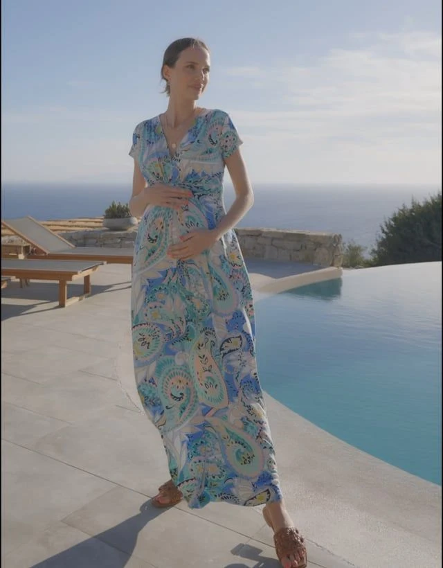 Notre robe longue de maternité à motif cachemire et avec nœud sur le devant, une superbe pièce maîtresse pour l’été, est conçue pour flatter votre silhouette à chaque étape de votre grossesse et après. Confectionnée dans notre jersey extensible emblématique, le devant noué crée des fronces flatteuses qui se drapent magnifiquement sur votre ventre qui s’arrondit à mesure que votre grossesse avance, puis effleurent librement votre silhouette post-partum plus tard, après la naissance de votre bébé. Dotée d’un superbe imprimé à motif cachemire, elle est parfaite pour les vacances au soleil, les occasions spéciales et les tenues d’été faciles à porter.