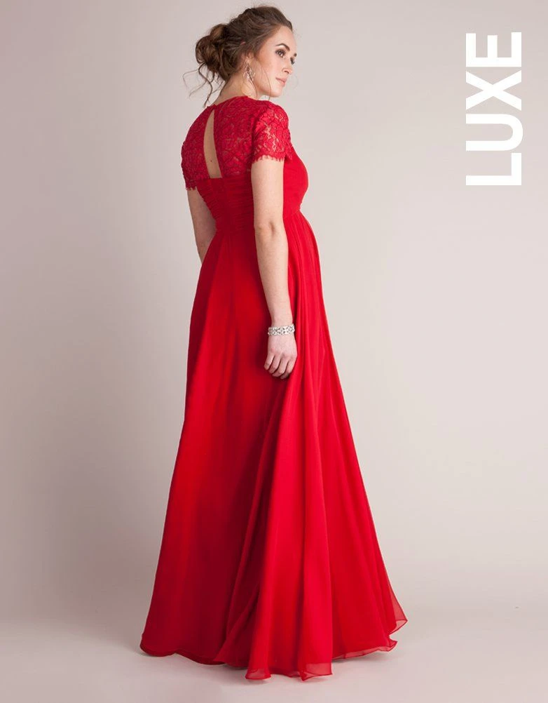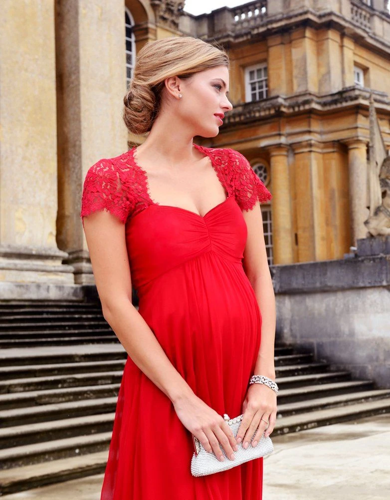 Faites une entrĂ©e spectaculaire Ă votre prochain Ă©vĂšnement avec notre sublime robe longue de grossesse en soie et en dentelle rouge. Celle-ci soulignera vos nouvelles formes de femme enceinte et vous sublimera grĂące Ă sa coupe longue descendant en cascade en toute Ă©lĂ©gance. Les manches en dentelle ainsi que l’ouverture goutte d’eau Ă l’arriĂšre accentueront votre allure. Notre robe de grossesse est dotĂ©e d’une bande stretch qui vous permettra de la porter Ă chaque Ă©tape de votre grossesse et mĂȘme aprĂšs.