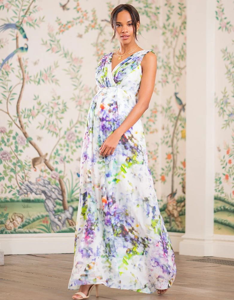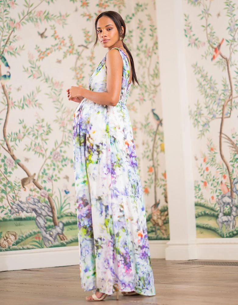 Conçue dans une soie fluide à l’imprimé pastel, notre très graphique robe longue de grossesse à motif floral resplendit d’élégance avec ses nuances de violet, vert, ivoire et rose. Flottant avec grâce jusqu’au sol, cette robe longue en soie entièrement doublée est un luxe indispensable, avec un drapé suivant sa ligne empire et sublimant votre silhouette avant, pendant et après votre grossesse. Son décolleté croisé à plis et ses larges bretelles vous offrent la possibilité de porter une lingerie à maintien, tandis que sa fermeture invisible sur le côté et sa bande stretch dans le dos vous permettent un ajustement tout en souplesse – Idéal pour une future maman sophistiquée.