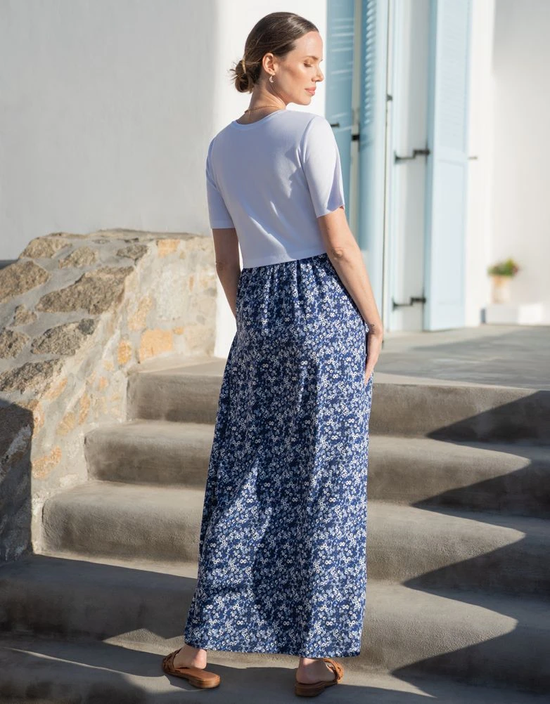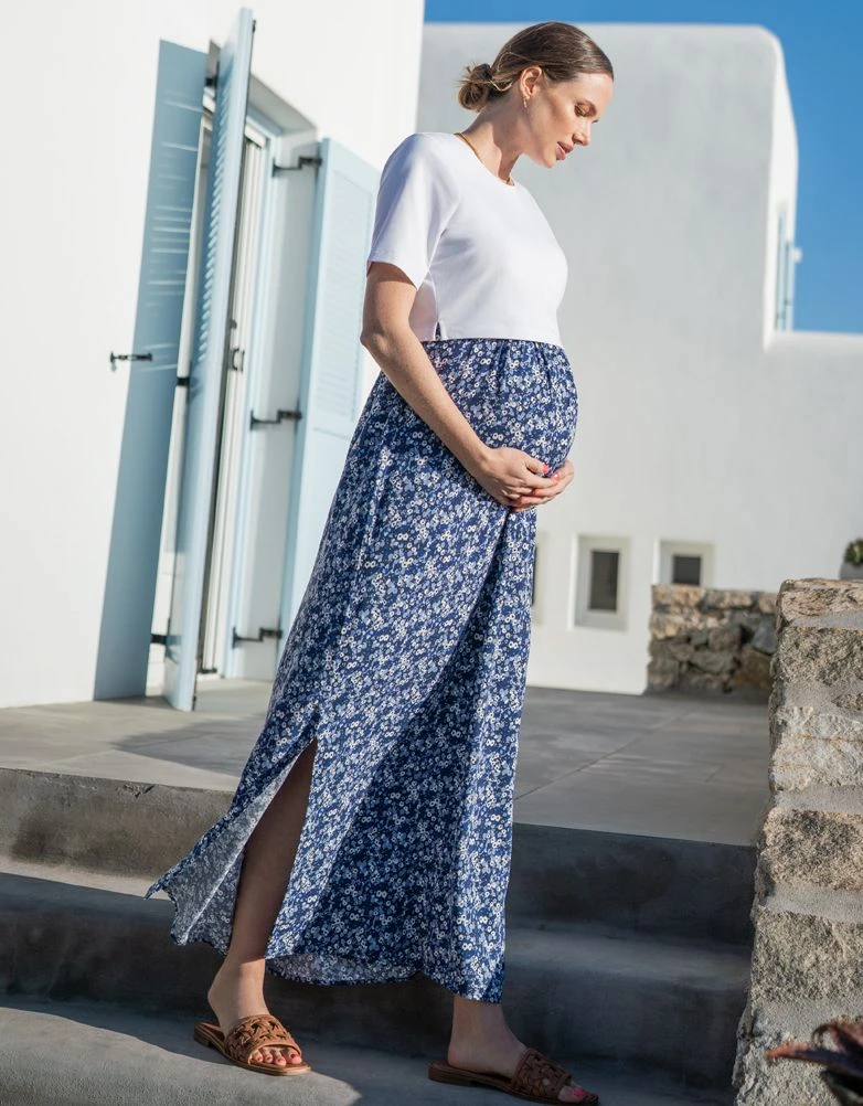 Douce, élégante et TELLEMENT facile à porter, notre robe longue grossesse et allaitement à fleurs bleues est parfaite pour les mois plus chauds. La magnifique jupe imprimée en bleu et blanc classique est fabriquée en viscose tissée douce, qui se drape magnifiquement sur votre silhouette et laisse beaucoup de place pour votre ventre qui grandit en même temps que votre bébé. Le haut blanc entièrement amovible en jersey modal doux est parfaitement coupé pour mettre en valeur votre taille empire. Après la naissance de votre bébé, le haut se soulève pour révéler une couche secrète qui facilite l’accès à l’allaitement. Associé à des sandales ou à des baskets, ce modèle est parfait pour les baby showers, les fêtes d’été ou pour être porté tous les jours.