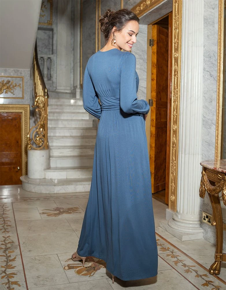 Élégante et fluide tout en étant pratique, notre robe longue grossesse et allaitement bleu ardoise est le choix parfait pour les occasions spéciales lorsque vous attendez bébé ou que vous allaitez. Confectionné en sublime viscose Lenzing™ EcoVero™, ce modèle ultra-doux drape magnifiquement vos courbes tout au long de la maternité. Avec ses finitions effet cache-cœur qui créent l’illusion d’une taille très haute, cette tenue intemporelle est également dotée d’une ouverture discrète pour allaiter en toute simplicité, parfaite pour les premières grandes sorties de bébé. À porter avec des talons et une pochette élégante pour les grandes occasions (mariage, baby shower, etc.).
