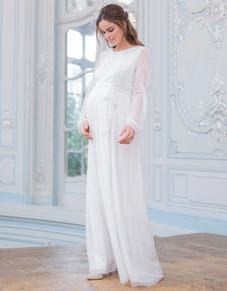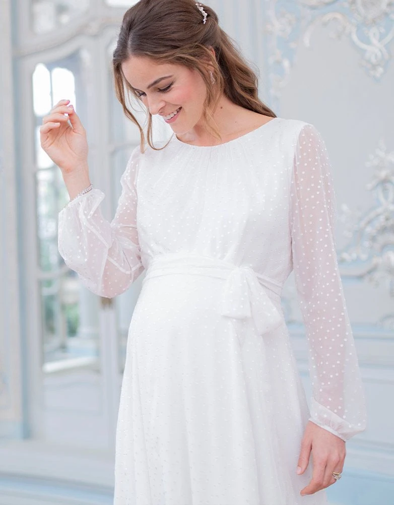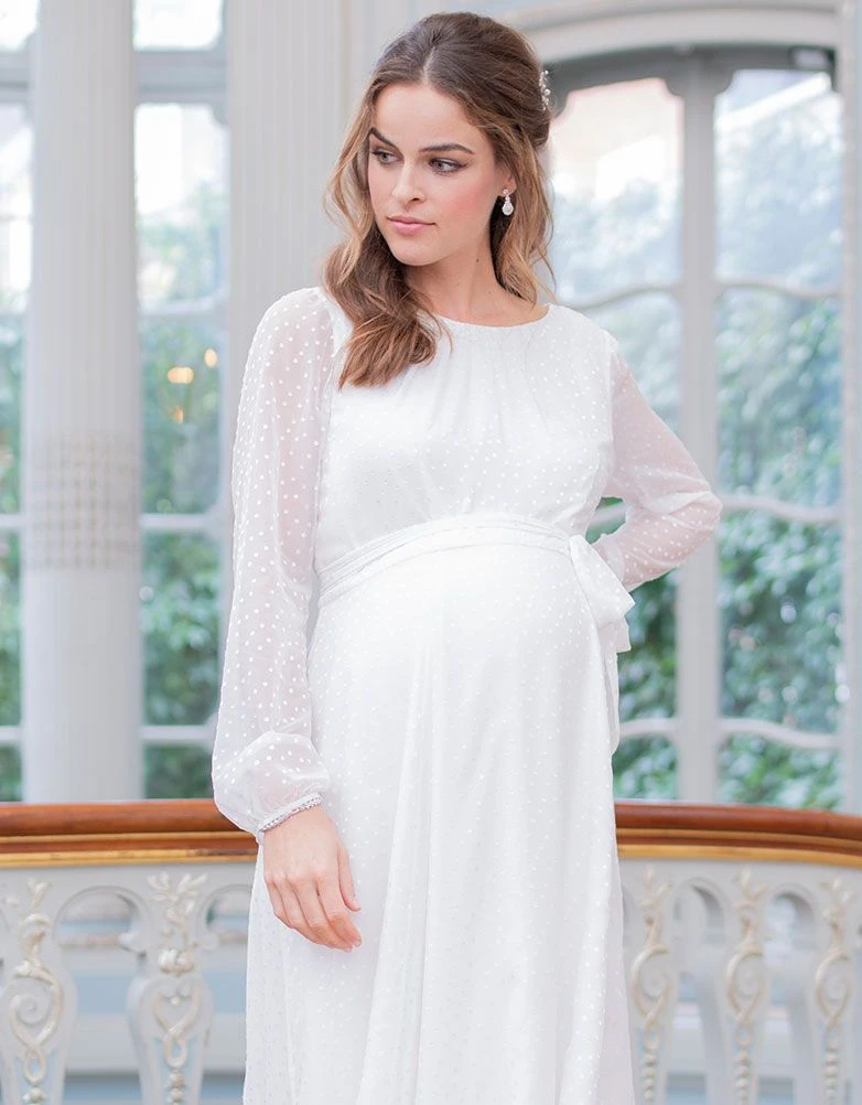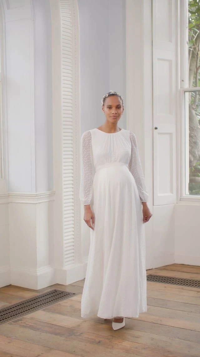 Manches longues avec un volume subtil et un dos en V sensuel, notre robe de mariée de grossesse en mousseline texturée combine une romance bohème avec une touche de modernité. Fabriquée en viscose délicatement texturée et entièrement doublée, cette robe englobe magnifiquement votre silhouette, tandis qu’une ceinture à nouer en option se fixe à la taille Empire, attirant l’œil vers votre point le plus mince. Des fronces douces à l’encolure complètent le look ultra-féminin – idéal pour votre journée spéciale.