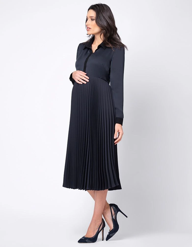 La robe mi-longue de grossesse et allaitement plissée est une option sophistiquée pour tout évènement chic. La chemise en soie y apporte une touche professionnelle, tandis que la jupe plissée tissée épouse votre nouvelle silhouette changeante. Un col et des poignets contrastées complètent le style.
