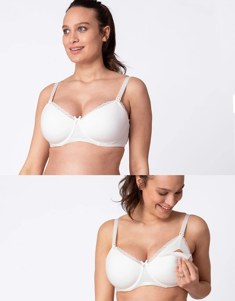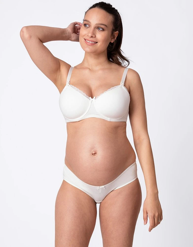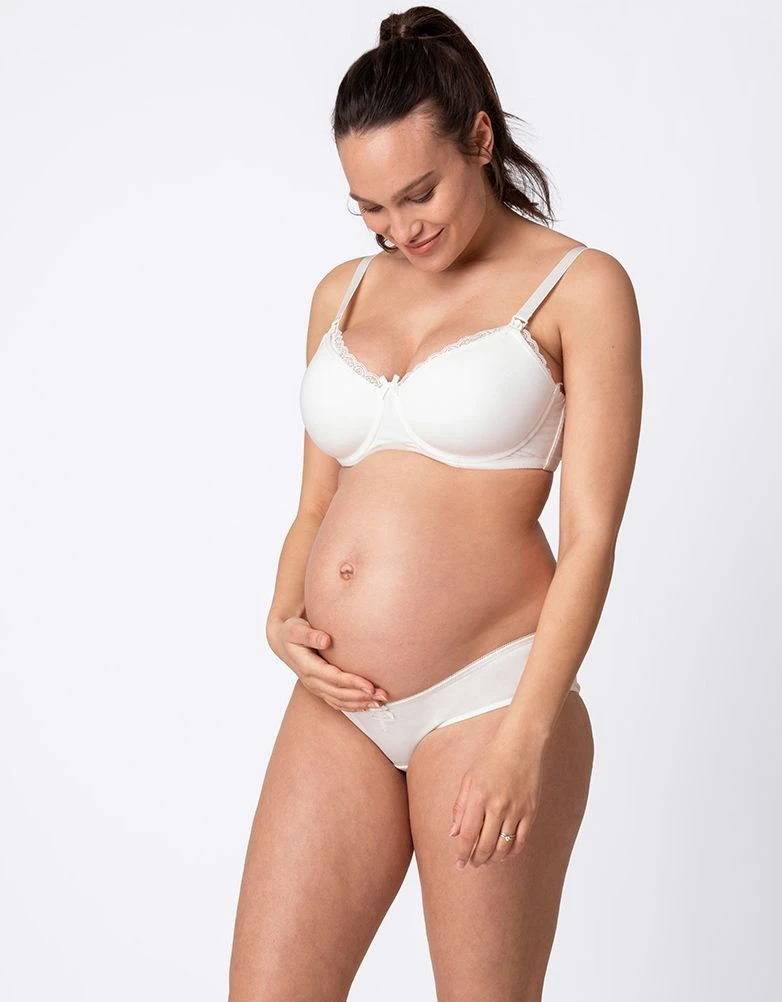 Classique, confortable et doux pour les peaux sensibles, notre soutien-gorge de grossesse et d’allaitement en coton blanc est un essentiel du quotidien. Les bonnets rembourrés discrets sont 100% coton avec une finition lisse en jersey de coton à l’extérieur et une finition féminine en dentelle à l’intérieur. De simples clips offrent un accès facile pour allaiter et la coupe ajustable permet au style de vous accompagner à chaque étape. Combinez-le avec la culotte de grossesse assortie pour un ensemble élégant à porter au quotidien.
