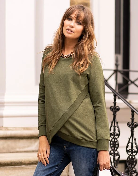Alliant confort et élégance, notre sweat grossesse et allaitement croisé vert olive est très simple à porter. Conçu dans une matière d’une douceur infinie, il drapera vos courbes parfaitement pendant toute votre grossesse et après l’accouchement. Après la naissance, le detail croisé à l’avant vous permettra d’allaiter aisément votre bébé. Ce sweat est un incontournable que vous devez absolument adopter. Portez-le avec un legging ou un jean slim pour un look tendance de tous les jours.