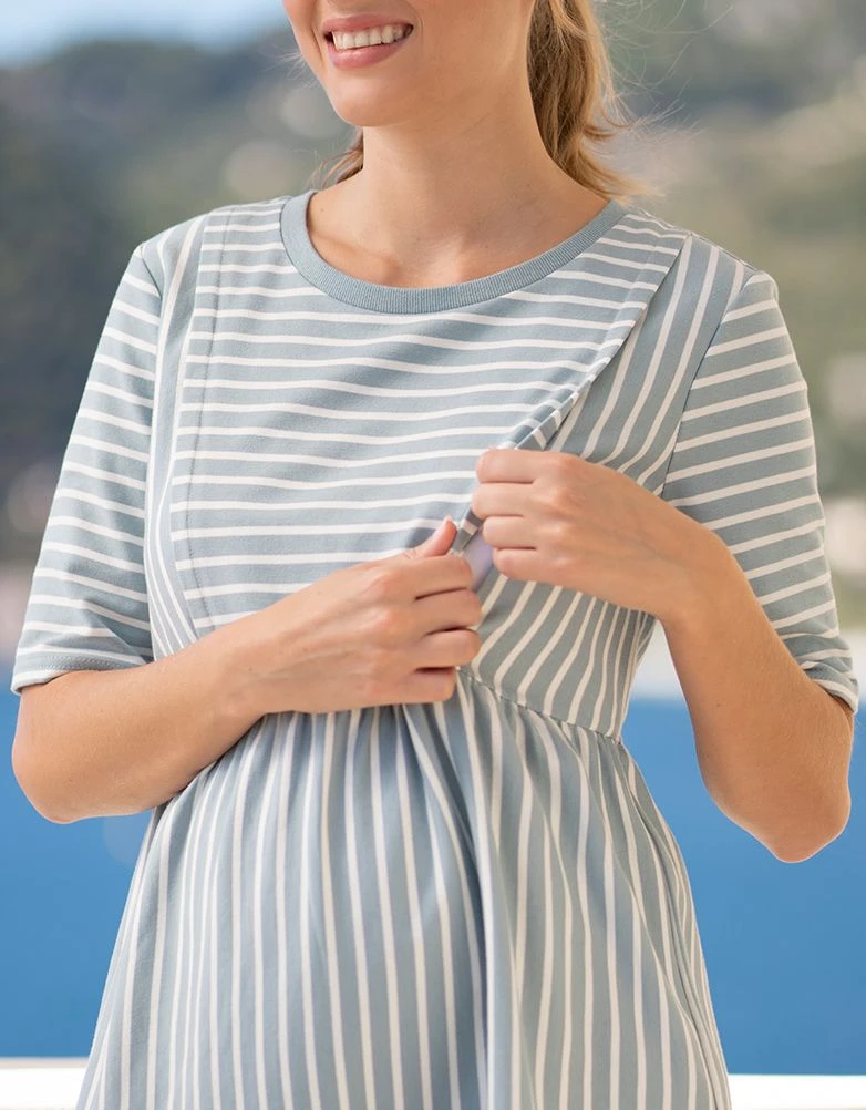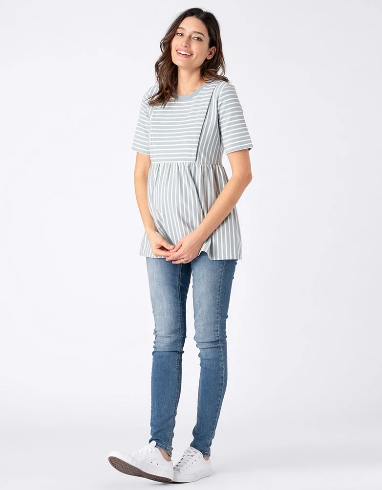 Seraphine T-shirt Ajusté De Maternité à Allaitement à Rayures Vert Sauge Et Blanc