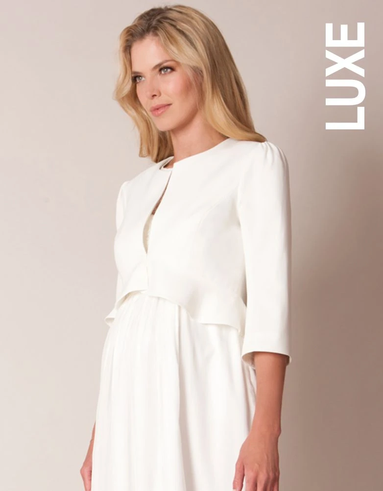 Conçue pour complimenter votre silhouette, notre veste de grossesse courte ivoire est parfaite pour la grossesse. Fabriquée dans un tissu doux et assorti, cette veste présente un détail élégant à la taille Empire, conçu pour envelopper votre ventre grossissant, tandis que des crochets et des œillets discrets assurent l’allure à l’avant. Enfilez-la par-dessus votre tenue de soirée ou portez-la avec du denim pour un look décontracté et élégant.
