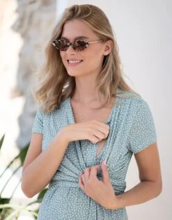 Seraphine Robe De Grossesse à Allaitement Vert Kaki à Imprimé Petites Fleurs Avec Haut