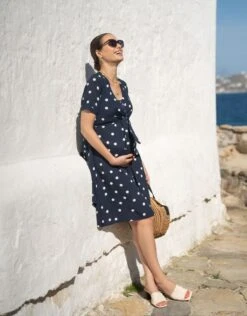 Seraphine Robe De Grossesse Et D’allaitement à Pois Bleu Marine Et Blanc Nouée Sur Le Devant