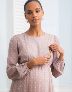 Seraphine Robe De Grossesse Et D’allaitement En Mousseline à Pois Taupe Et Blanc